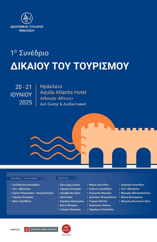 Το πρόγραμμα του 1ου Συνεδρίου Δικαίου του Τουρισμού, που διοργανώνει ο Δικηγορικός Σύλλογος Ηρακλείου στις 20 και 21 Ιουνίου 2025, στο ξενοδοχείο Aquila Atlantis Hotel, μπορείτε να δείτε εδώ.